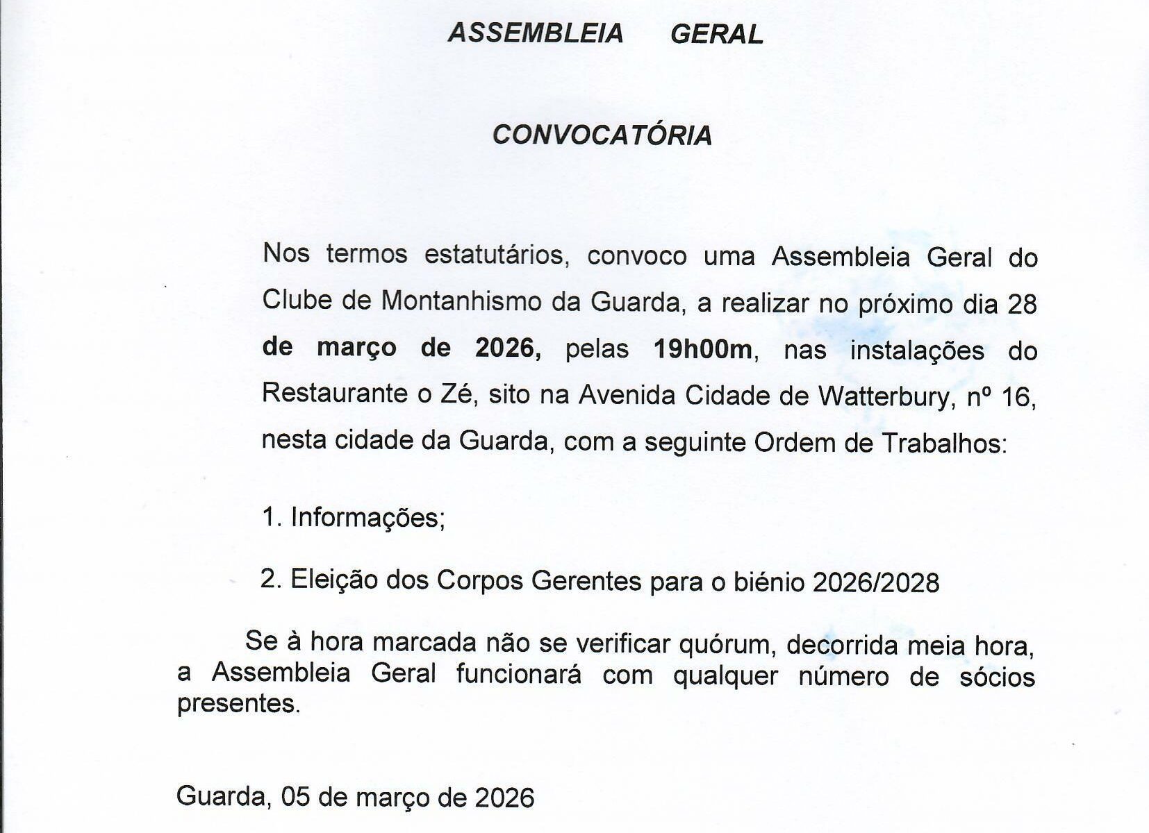 Informamos que se irá realizar uma Assembleia Geral do Clube de Montanhismo da Guarda, no próximo dia 28 de Março de 2026, pelas 19h00m (Eleição dos Corpos Gerentes para o biénio 2026/2028), nas instalações do Restaurante “O Zé”, sito na Avenida Cidade de Watterbury, nº 16, nesta cidade da Guarda.